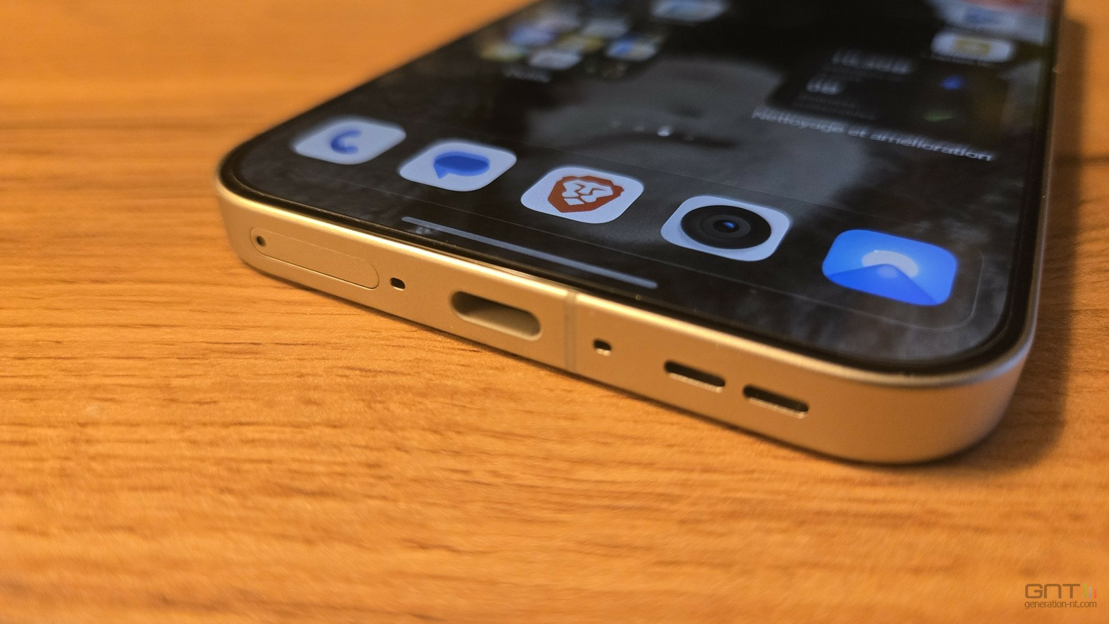 Sur la tranche supérieure, on trouvera le port infrarouge pour transformer le smartphone en télécommande tandis que la tranche inférieure loge le chariot SIM et le port USB-C pour la charge et la synchronisation.