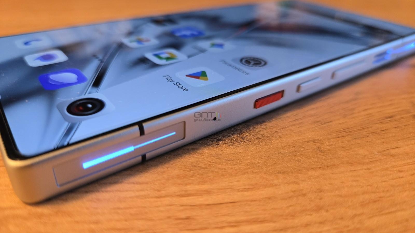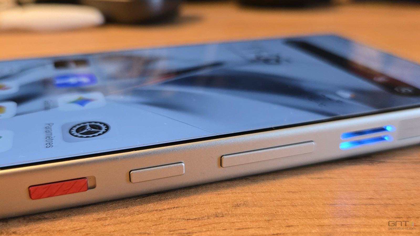Sur les tranches, on retrouve les boutons d’alimentation et de volume mais aussi un slider de couleur rouge permettant de basculer directement vers l’interface gaming spécifique du REDMAGIC 11 Pro.