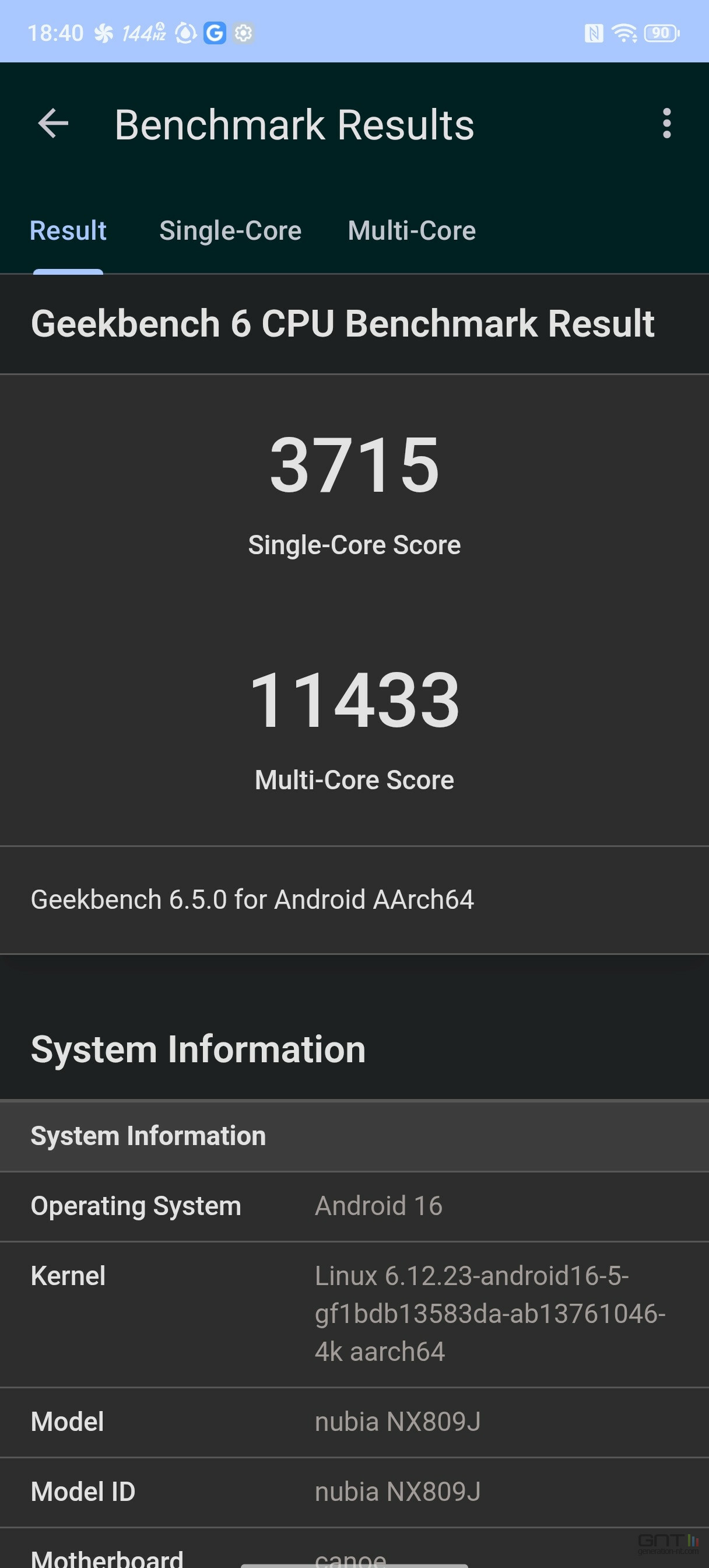 Cet ensemble processeur + refroidissement permet d’obtenir de solides performances, comme en témoignent les résultats en benchmark. Sur Geekbench 6, le REDMAGIC 11 Pro atteint des scores de 3715 points en test single core et 11 430 points en test multicore.