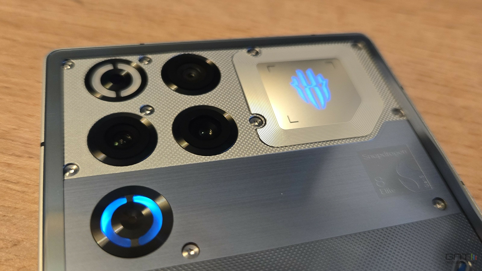 Contrairement à la plupart des smartphones, le bloc photo ne dépasse pas de la coque et permet ainsi de poser le REDMAGIC 11 Pro à plat pour jouer ou se divertir. A droite des différents capteurs, le logo de la marque peut s’illuminer et produire des effets RGB.