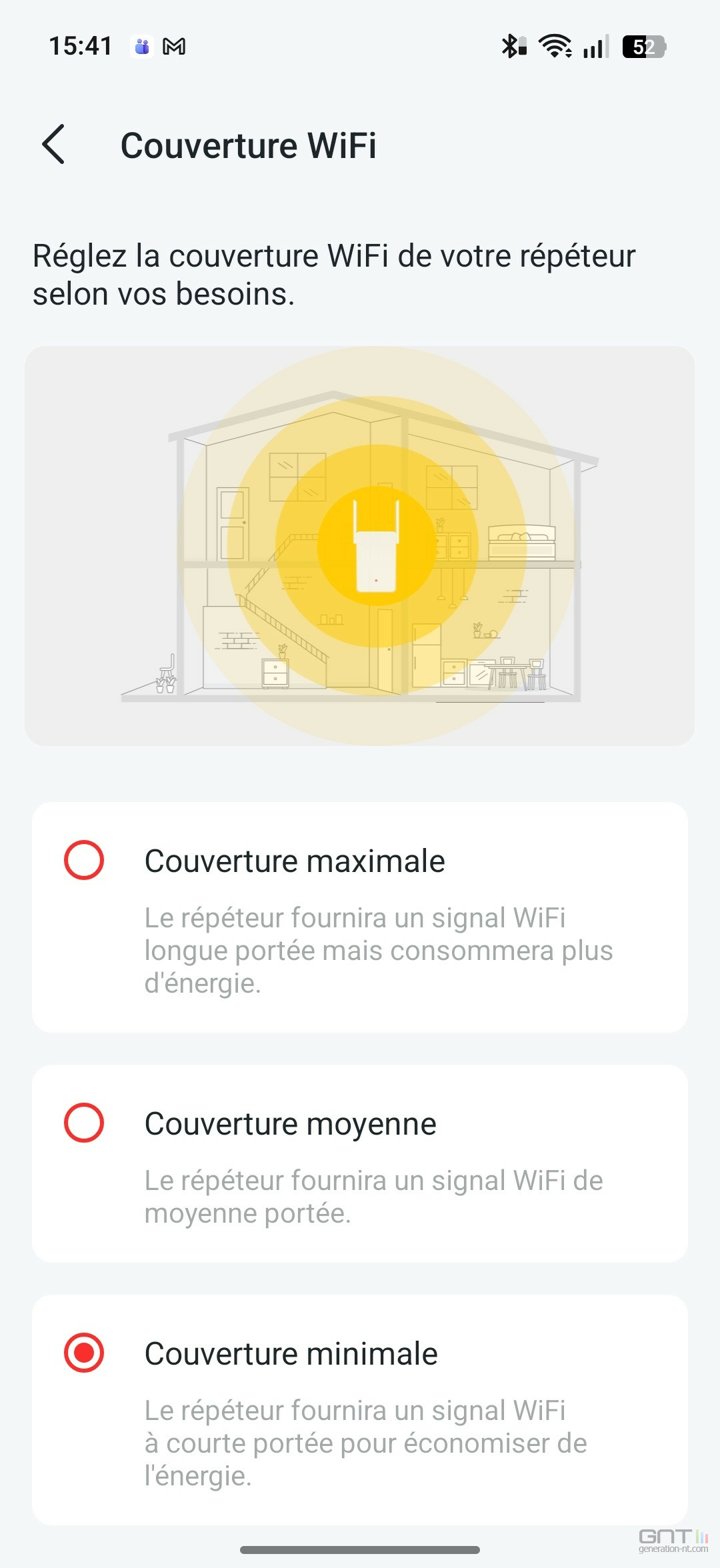 La première fait tourner le répéteur ou le point d’accès à pleine puissance pour assurer une couverture la plus étendue possible, les autres réduisent la puissance pour un profil moins énergivore mais avec une portée plus réduite. Le choix se fera en fonction des attentes et de la disposition des locaux.